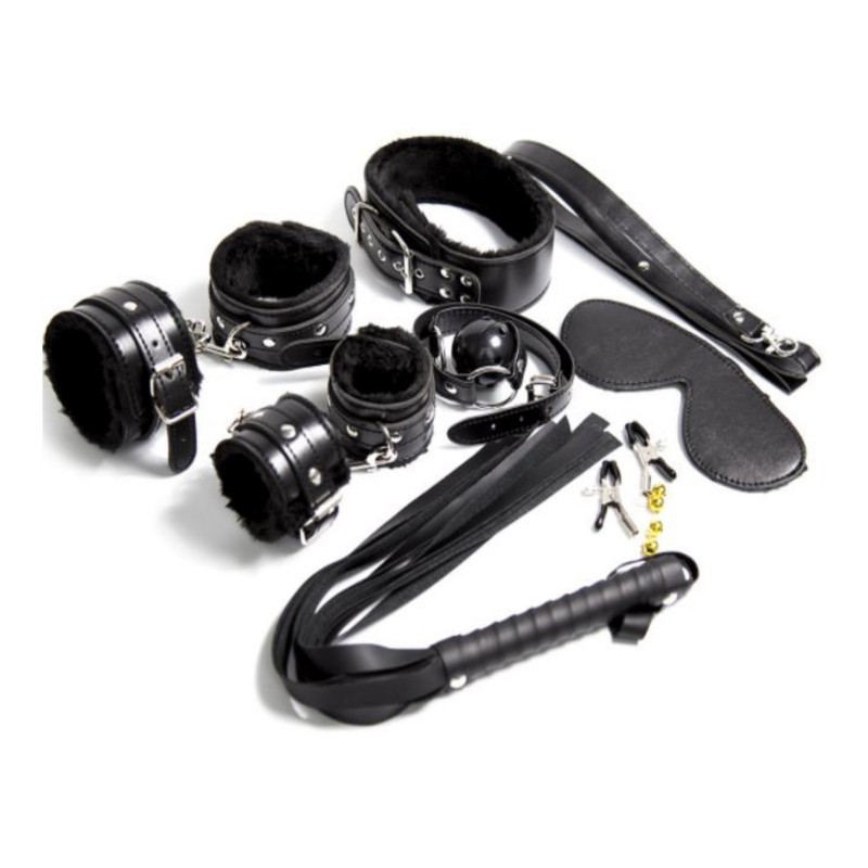 БДСМ набір чорний для ігор з 7-ми предметів, наручники і наножники з хутром, нашийник з хутром і повідцем, кляп з кулькою, маска на очі, затискачі на соски і батіг.